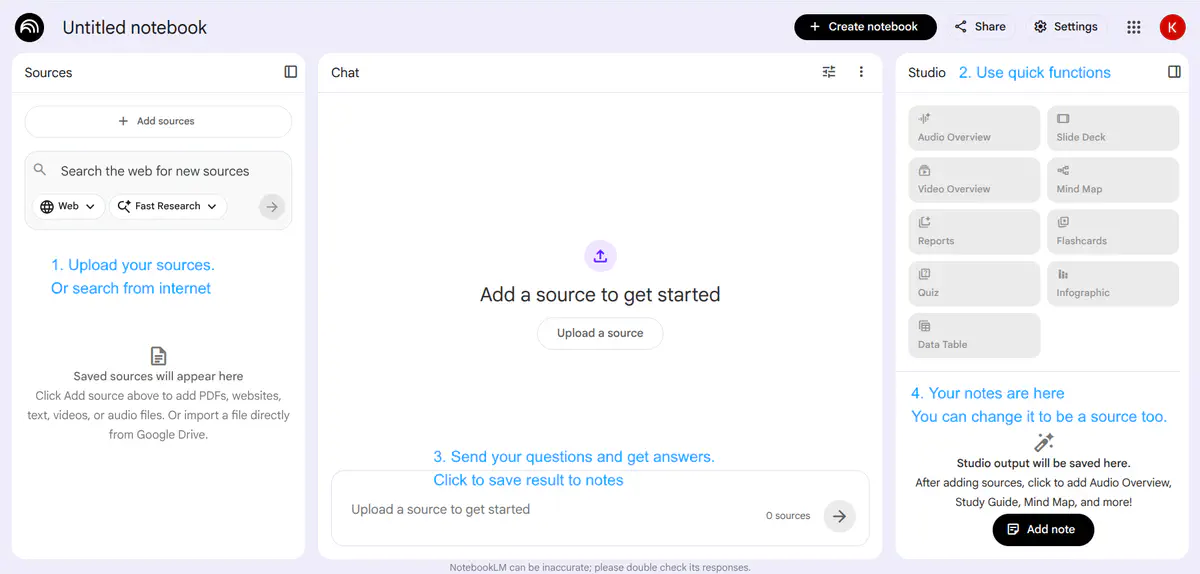 💡 Tip: You can click to button in studio area to generate study materials like audio overview, video overview, slide deck, mindmap, flashcards, quiz, infographic… (as a note) quickly